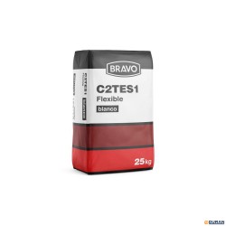 Adhesivo cementoso Flexible de alta adherencia C2TES1, servido en sacos de 25 kilos, acabado en color blanco, fabricado por Bravo.