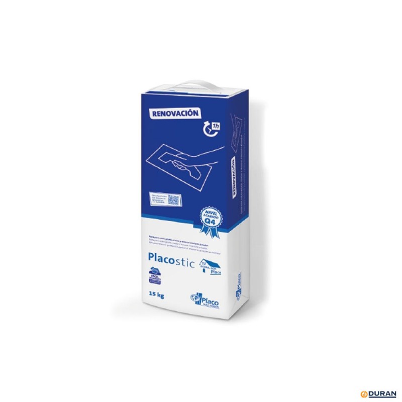 Pasta para cubrir gota, nivelar y renovar interiores pintados, con acabado listo para pintar, sacos de 15 kilos, con acabado color blanco. Modelo PLACOSTIC RENOVACION 1 Hora, distribuido por Placo